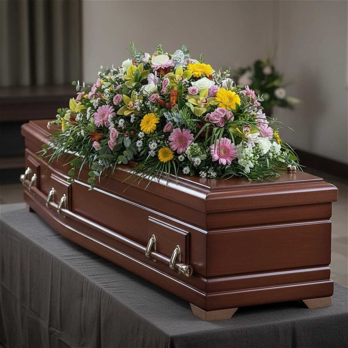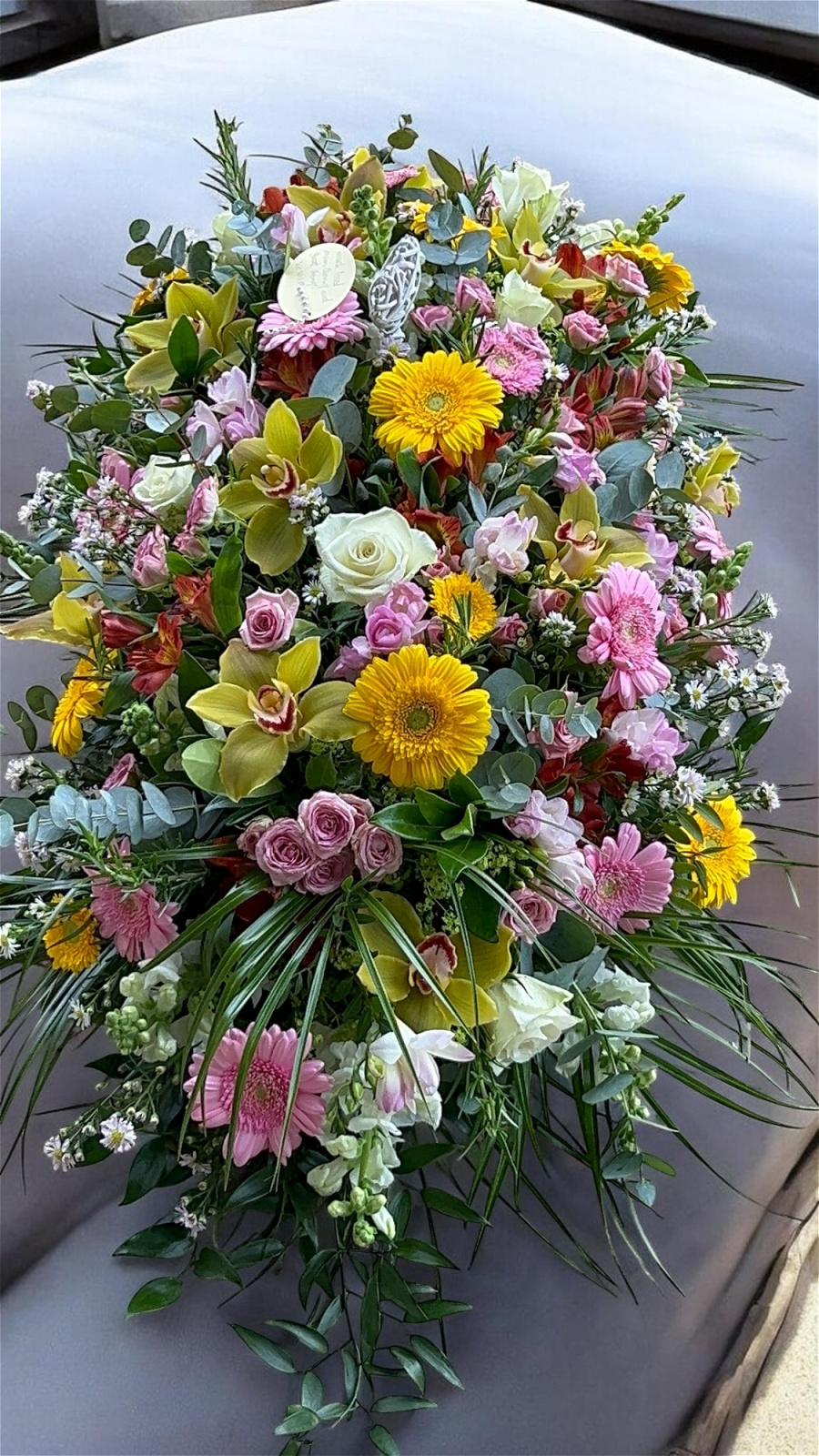 This beautiful coffin spray is designed to honour a life full of love, colour, and cherished memories. Featuring fresh pink and white Roses, Orchids, Gerberas, and seasonal blooms in uplifting shades of pink, white, red, and Green, the arrangement is finished with elegant greenery for a graceful and personal touch.